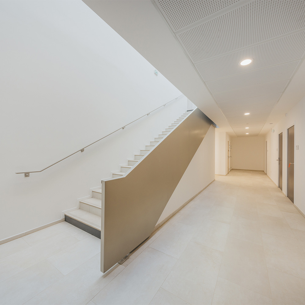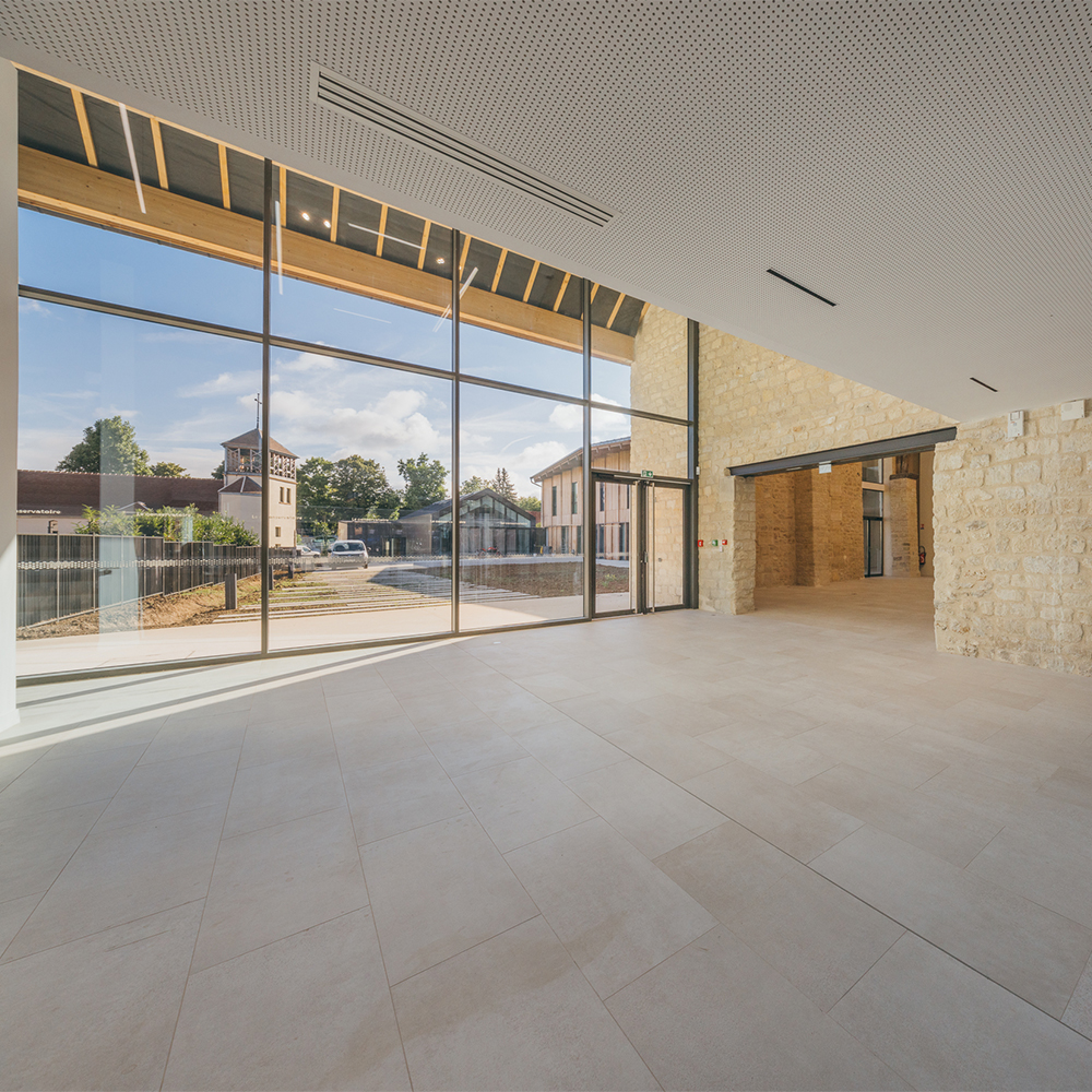 • Les espaces ouverts au public se trouvent au centre de la composition, prolongeant la « grange » avec une double façade vitrée, et deviennent ainsi un lieu de vie et d’échanges pour tous les usagers.